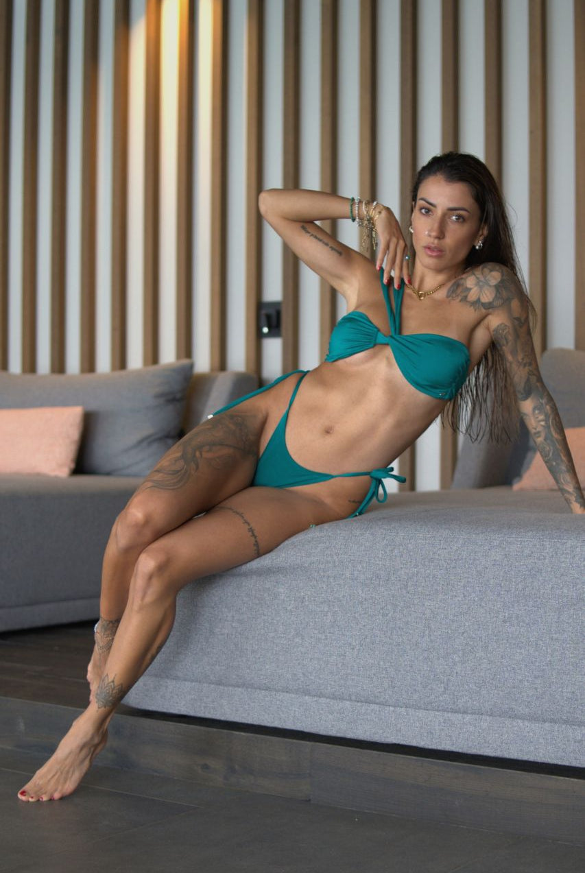 Nookini is best known for its glamorous bikinis, the so-called glitter bikinis. I, Noora, love a certain touch of elegance and a classy look. That's why I use Lycra Shiny fabrics. The special thing about these bikinis is that they literally shine in the sunlight and the colors come out beautifully. We also offer a small collection made of ECO RIB, for women who prefer ribbed fabrics, as well as some matte bikinis for those who like it more simple.